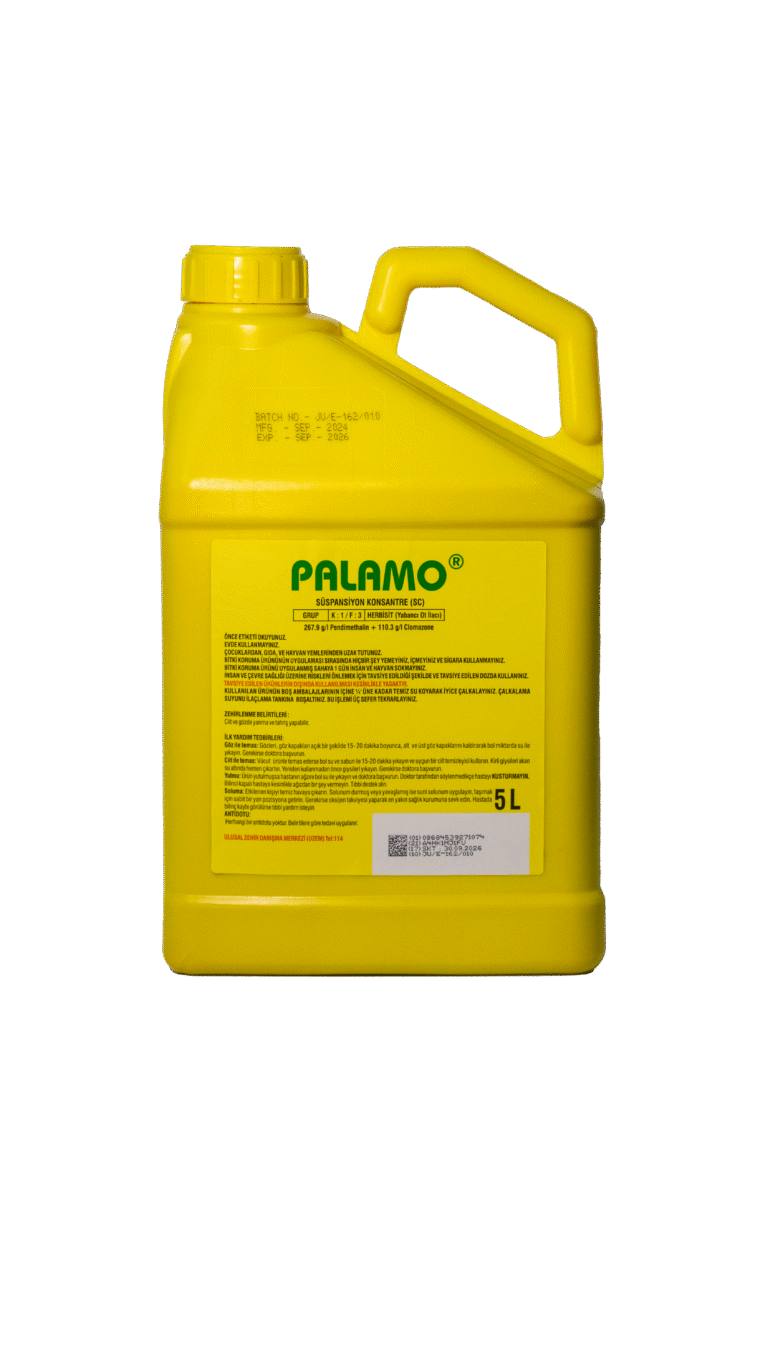 Palamo is a mixture of Clomazone and Pendimethalin and is a selective and permanent herbicide that is effective by inhibiting both chlorophyll and carotenoid biosynthesis in weeds. This herbicide, applied to the soil before planting, controls the growth of difficult-to-control weeds such as Darıcan, Purslane and Cockroach by inhibiting it. Its dosage is lower than its competitors, with a very good protection time, it provides long protection until the end of the season compared to other formulations.